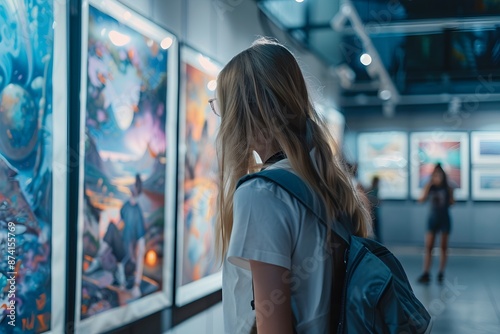 art, gallery, painting, exhibition, modern, colourful, artwork, museum, visitor, backpack, blond, woman, appreciation, culture, creativity, indoor, display, frame, contemporary, visual, aesthetic, admiration, artistic, viewing, exploration, inspiration, design, talent, expression, imagination, perspective, showcase, lighting, interior, sharpened, detail, scene, people, background, blurred, space, atmosphere, event, public, education, leisure, hobby, passion, tour