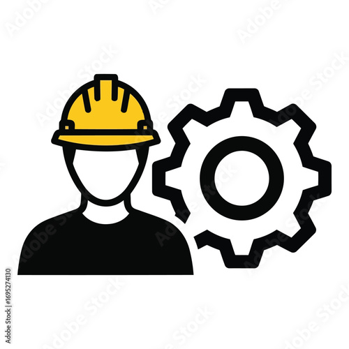 Art of worker wearing a yellow hard hat standing next to a cogwheel, isolated on white background