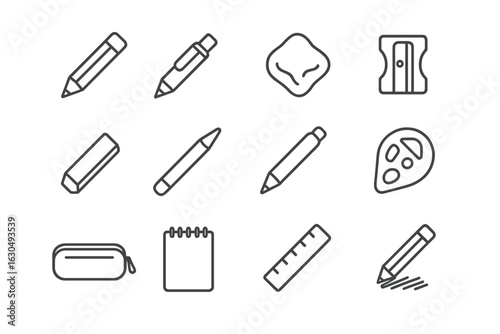 Art supplies: pencil, eraser, sharpener, and more school essentials icons