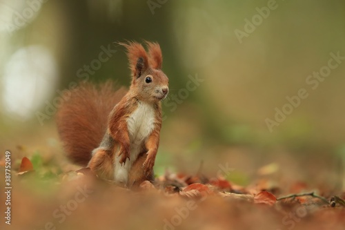 Art view on wild nature. Cute red squirrel with long pointed ears in autumn scene . Wildlife in october forest. . Sciurus vulgaris