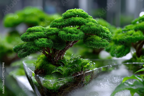 Artful bonsai tree grows in a clear container surrounded by lush greenery in a serene indoor setting