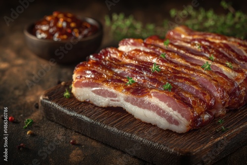 Artfully arranged bacon strips on rustic board with dipping sauce