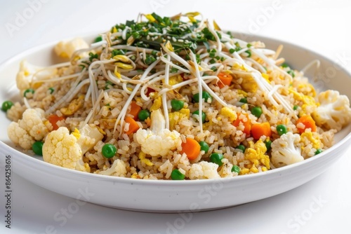 Artfully Crafted Cauliflower Fried Rice with Emerald Peas and Bean Sprouts