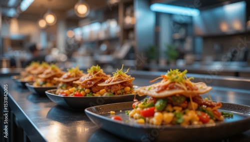 Artfully Plated Gourmet Vegetable and Tortilla Stack in Modern Restaurant Kitchen Setting