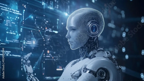 Artificial Intelligence Robot Analyzing Data on Digital Interface - A humanoid robot with a futuristic design interacts with a complex digital interface, symbolizing the future of technology, automati