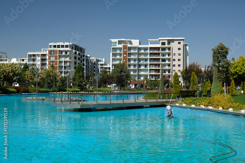 artificial pond with blue water in the park and buildings in the background, Tashkent