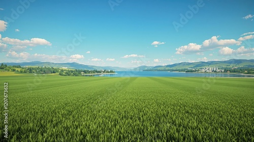 Artificial turf landscape with a serene lake and surrounding hills in the background, nature, terrain, hillside, lake, environment