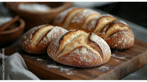 Artisan bread loaves on wooden board in warm kitchen light with copy space