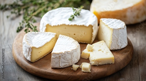 Artisan cheese selection displayed on a wooden board with fresh herbs in a rustic setting