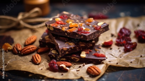 Artisan chocolate with nuts and dried fruits, rustic setting