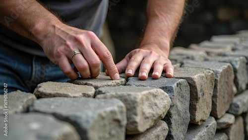 man, hand, landscaping, precision, craftsmanship, garden, yard, construction, foundation, hard-wearing, hand tool, levelling, safety, stone wall, environment, aesthetic, design, landscape architecture, fence, maintenance, rustic, rural, stone carving