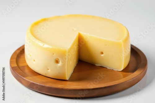 Artisanal cheese wheel, pristine white backdrop, kitchen, white background