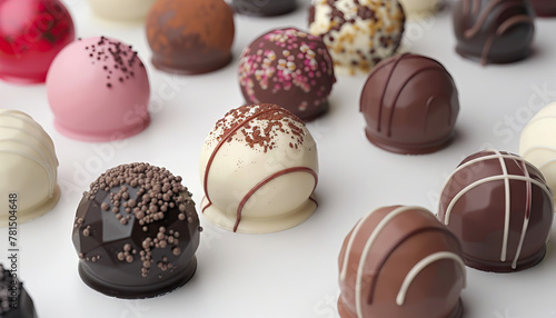 Artisanal Chocolates and Truffles: Handcrafted chocolates, truffles, and pralines in assorted flavors and designs presented in a chocolate boutique or confectionery.