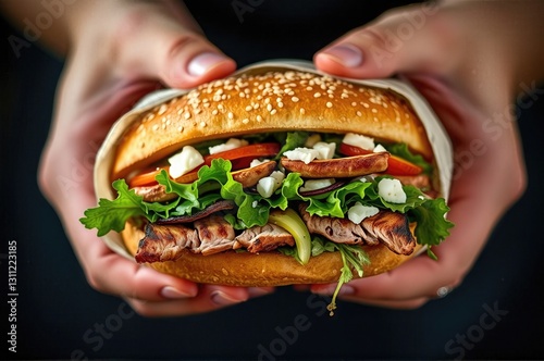 sandwich, burger, epicure, hand-made, artisanal, sesame, bun, meat, greener, cheese, tomatoes, parchment, enclosed, epicure, gastronomy, hand-held, lunch, delicious, fresh, healthy, mediterranean, culinary, homemade, organic, rustic, appetising, savoury, meal, snack, casual attire, dining, cookery, alimentary, wholesome, flavorful, tasty, hearty, satisfying, delicacy, crafted, mouth-watering, texture, juicy, crisp, balanced, vibrant