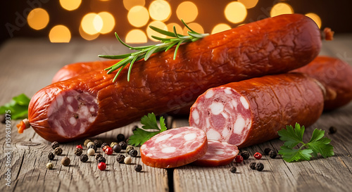Artisanal Salami on Rustic Wood with Festive Bokeh Background A Culinary Delight Featuring Rosemary Parsley and Colorful Peppercorns