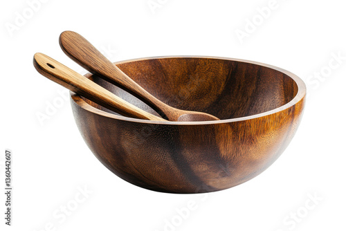 Artisanal wooden bowl embraces handmade spoons promising savory delights a natural table setting with studio lighting and dark background contrast.