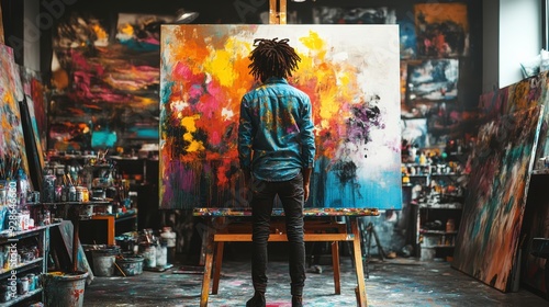 Artist admiring large abstract painting in messy studio