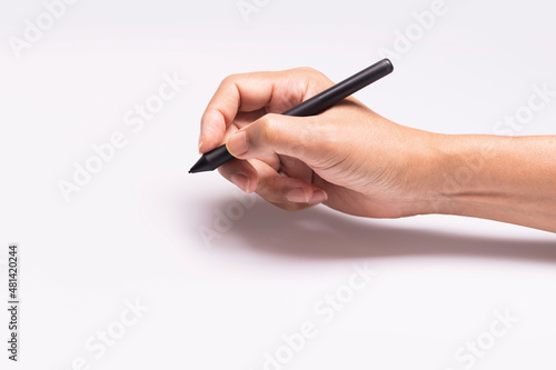 Artist hand holding stylus isolated on white surface