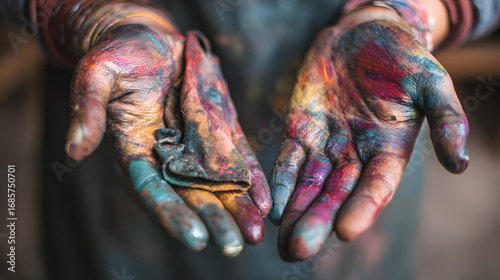 Artistic Expression: A close-up shot of two hands covered in a vibrant array of paint, capturing the essence of creativity, passion, and the immersive process of art-making.
