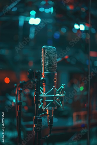 Artistic Flair Whimsical Microphone in Concert Hall, Illuminated by Ambient Lighting, Evoking Live Performance