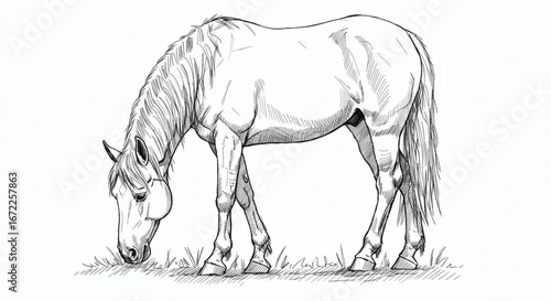 Artistic Horse Drawing Detailed monochrome illustration of an equine animal gracefully grazing in a field, rendered with elegant lines and subtle cross-hatching, highlighting the beauty of nature
