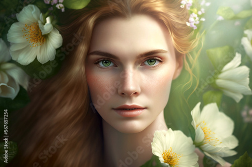 Artistic portrait of a beautiful blonde woman model posing in flowers as a floral painting of spring theme. Illustration created with generative AI tools.