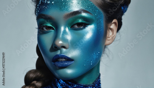 blue, model, face paint, studio, beauty, make-up, portrait, creativity, glistering, fashion, hairdresser, cosmetic, vibrant, colours, aesthetic, expression, design, hair, braid, shimmer, contemporary, shine, dramatic, bold, skin, texture, lighting, elegance, captivating, editorial, unique, stunning, enchanting