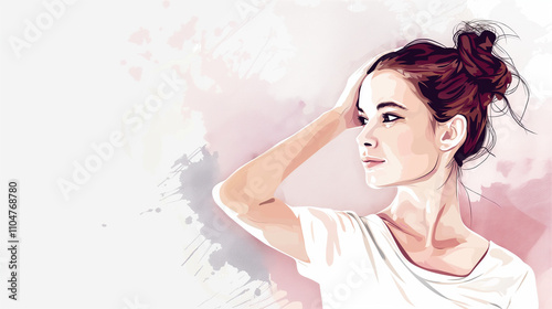 Artistic portrait of a young woman with a watercolor backdrop in a relaxed pose.