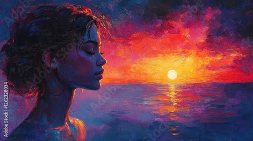sunset, painting, portrait, art, expression, creative, woman, ocean, silhouette, dusk, colours, beauty, scenery, emotional, warm, serene, high-coloured, landscape, sky, nature, imaginative, tranquil, vibrant, artistic, profile, evening, graceful, sunlight, wave, charme, peaceful, stillness, allure, inspiration, modern, dreamy, scenic, striking, visual, detail, canvas, artwork, color palette, sunshine, horizon