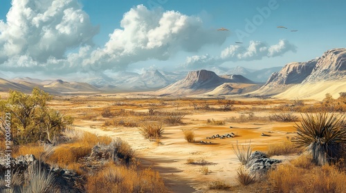 artistic rendering of an ancient desert landscape where dinosaurs once roamed, with sand dunes and dry vegetation