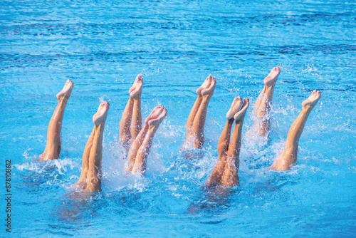 Artistic swimming team performing synchronized legs movement in swimming pool