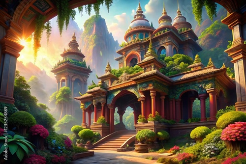 Artistic Temple Arches in Vibrant Landscape: Painted Stone Gateway Photography