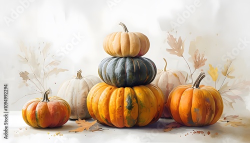 Artistic Thanksgiving Still Life of Stacked Pumpkins in Various Colors and Textures