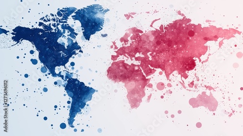 Artistic watercolor map of the world in blue and red with splashes and creative details, perfect for global themes and concepts