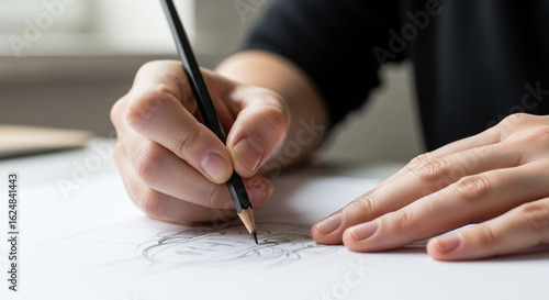 Artist's hand sketching a detailed drawing with a graphite pencil on white paper.