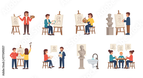 artist, painting, drawing, sculpture, easel, palette, brush, canvas, studio, art, creative, portrait, vignetting, figure, model, workshop, lesson, class, education, skill, talent, practice, craft, design, illustration, cartoon, vector, people, woman, man, children, group, together, collaboration, learning, teaching, inspiration, imagination, style, technique, colours, shape, form, composition, perspective, light, shadow, texture, detail