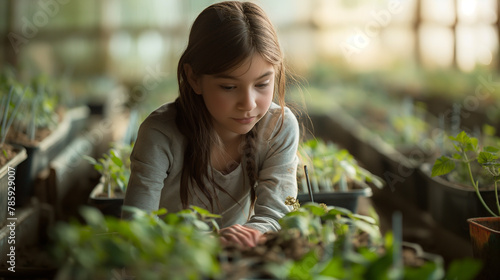 As spring begins to awaken, a young girl shoulders the responsibility of caring for the plants in the greenhouse, her determination evident in the way she tends .