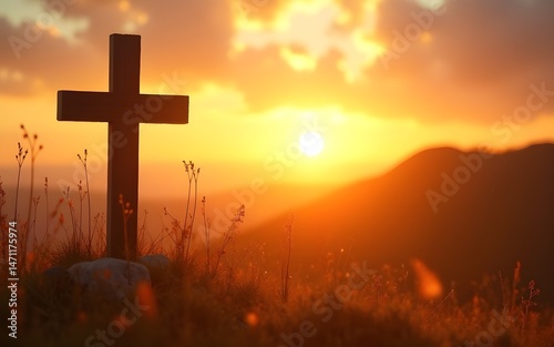 Ascension day concept. The cross on meadow autumn sunrise background., orthodox easter. High quality