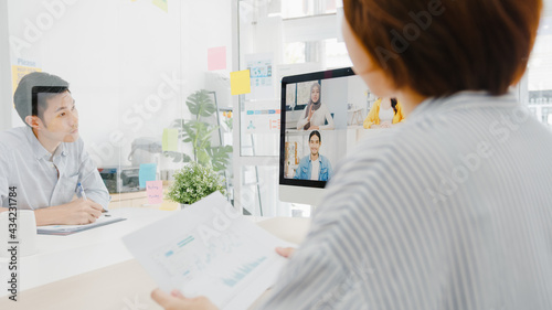 Asia businesspeople using desktop talk to colleagues discussing business brainstorm about plan in video call meeting in new normal office. Lifestyle social distancing and work after corona virus.