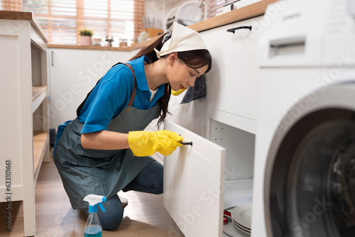Asia woman in workwear maid cleaning home holding bottle spray and wiping with microfiber cloth in kitchen room at home