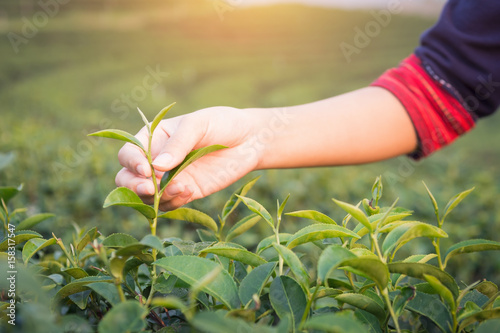 Asia Woman picking tea leaves in tea plantation