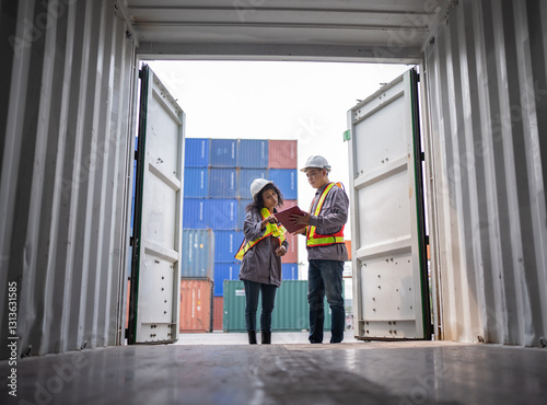 Asia worker man and woman working with checking container at container site