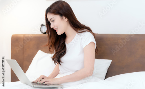 Asian beautiful woman Using laptop Search the internet She smiled and was happy. In the bedroom