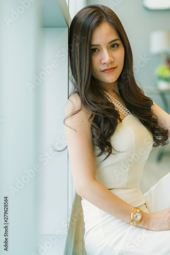 asian beautiful woman with brown long hair portrait white costume smile happiness and confident vacation concept
