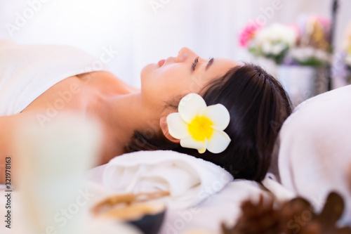 Asian Beautiful, young and healthy woman in spa salon. Massage treatment spa room . Traditional medicine and healing concept.