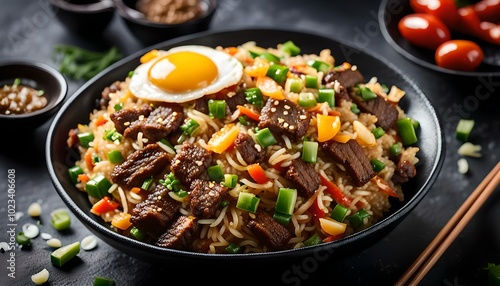 Asian Beef Fried Rice with eggs and vegetables in black bowl