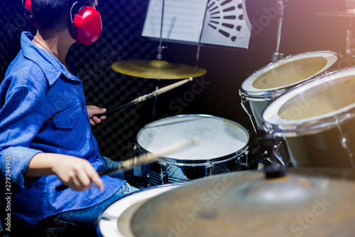 Asian boy put blue shirt and red headphone to learning and play drum set with wooden drumsticks in music room. The concept of musical instrument, Side view to drum player and selective focus.
