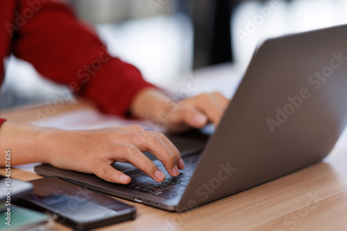 Asian Business woman using calculator and laptop for doing math finance on an office desk, tax, report, accounting, statistics, and analytical research concept