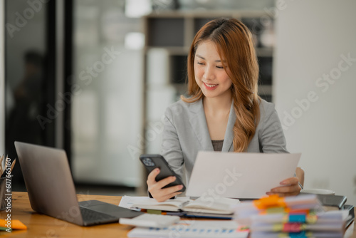 Asian business woman Working at the office, use notebook, smart phone
