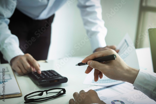 asian businessman or accountant working pointing graph discussion and analysis data charts and graphs and using a calculator to calculate numbers.Business finances and accounting concept